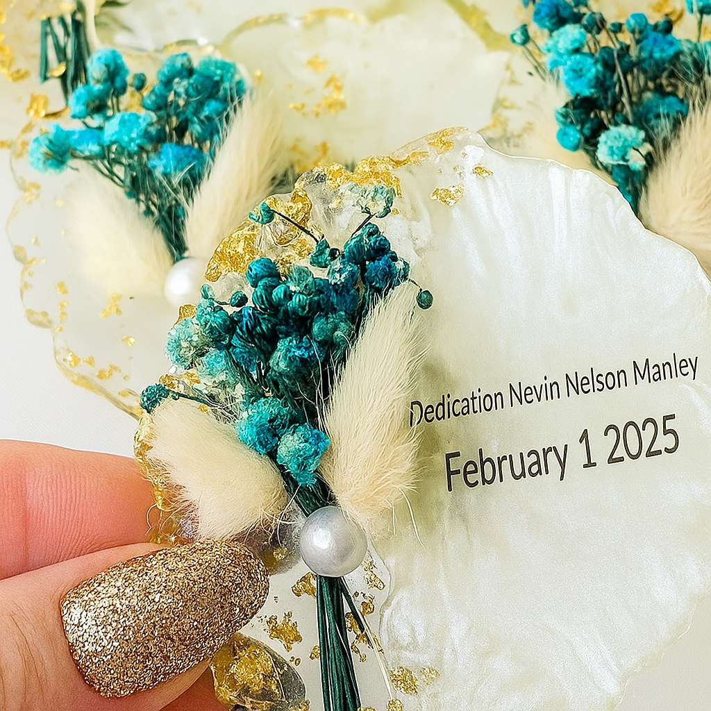 Handcrafted resin magnet featuring dried blue florals, gold leaf, and pearl accents. A unique keepsake for events and home décor.