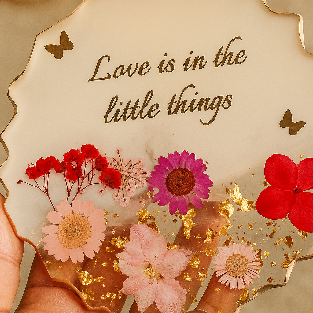 Handmade resin coaster featuring embedded dried flowers, golden flakes, and a motivational quote 'Love is in the little things'. A perfect décor accent or thoughtful gift.